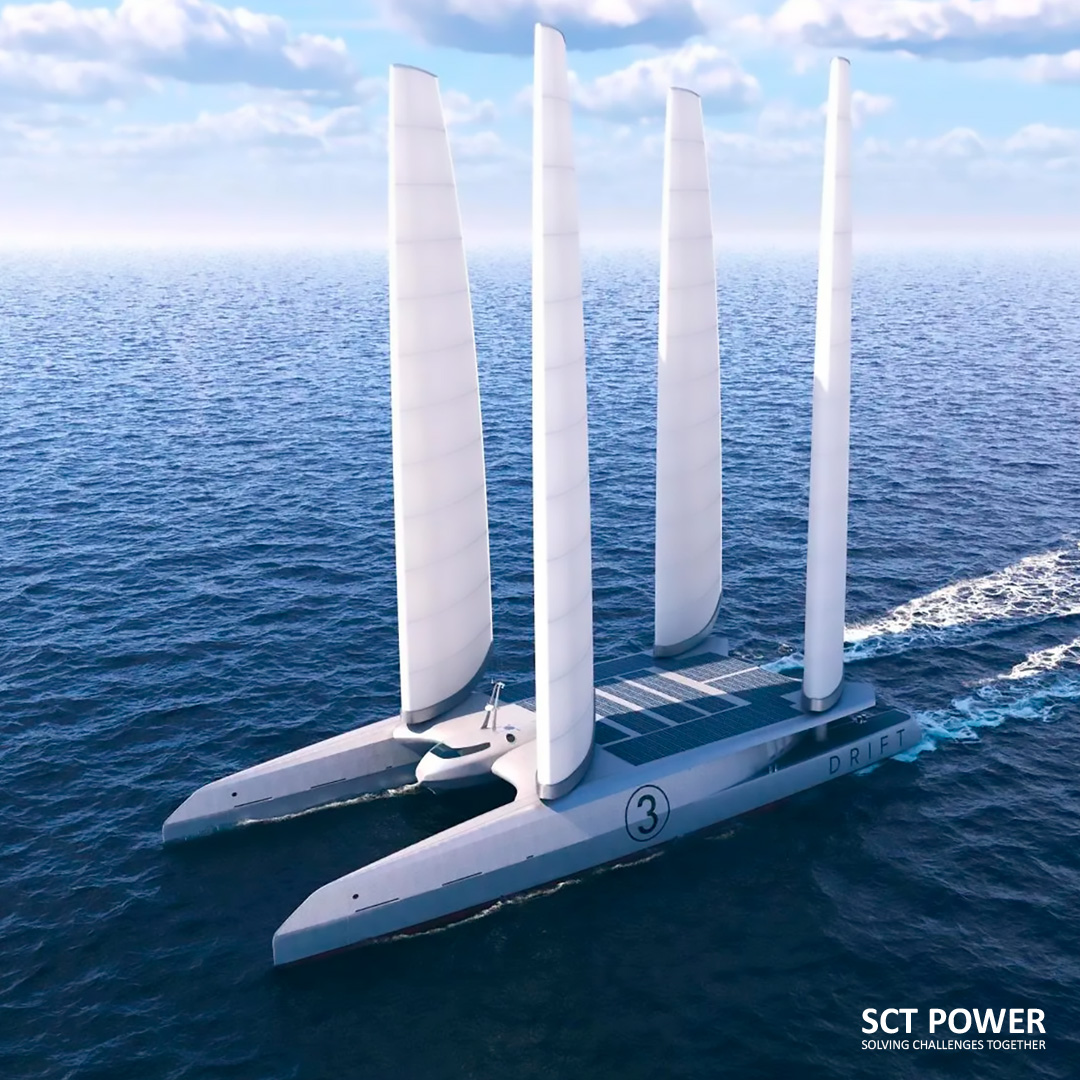 A empresa inglesa Drift está a tentar utilizar a energia do vento que sopra da terra para o mar, sendo os catamarãs equipados com hidrofólios que os elevam da água e uma turbina subaquática, que funciona captando anergia à medida que a embarcação navega. Cada navio terá seis tripulantes e é necessário descarregar o hidrogénio num porto, em média, uma vez por semana.